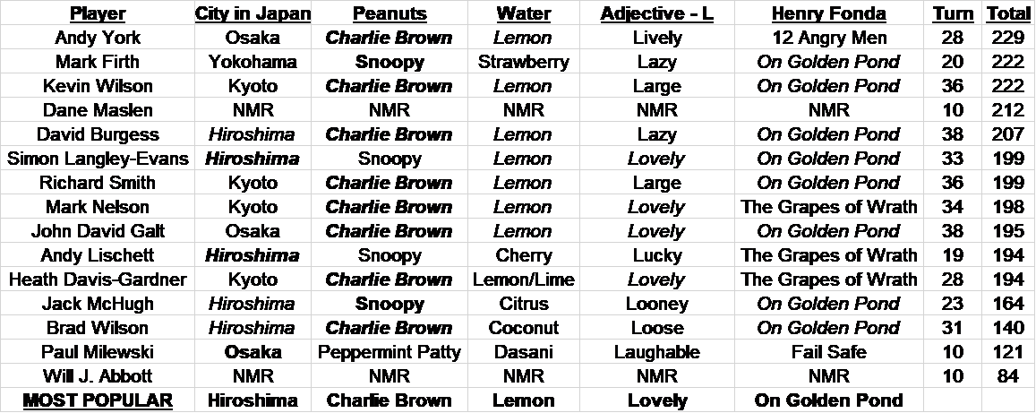 the high score this round with 36 (out of a possible 40). Paul Milewski scores the bottom with 10. Every player who chose Charlie Brown used