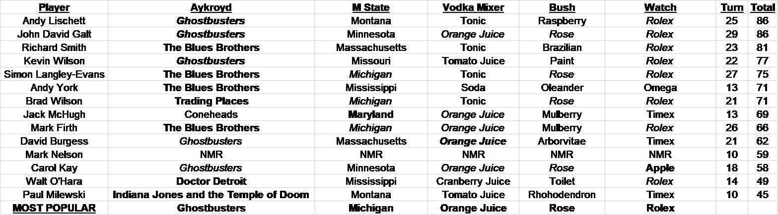 Joker category shown in BOLD. Most popular answer shown in italics (if I