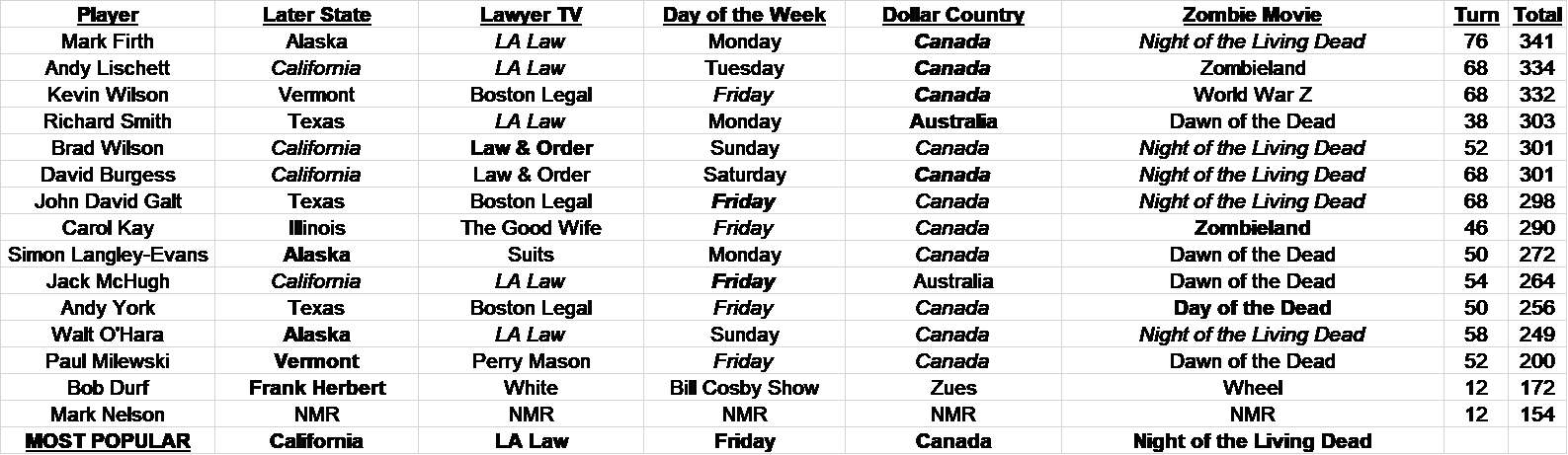 Joker category shown in BOLD. Most popular answer shown in italics (if I