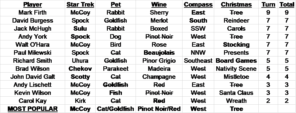 Joker category shown in BOLD. Most popular answer shown in strikethrough.