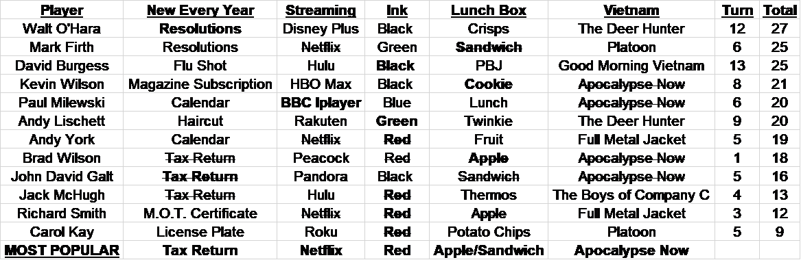 Joker category shown in BOLD. Most popular answer shown in strikethrough.