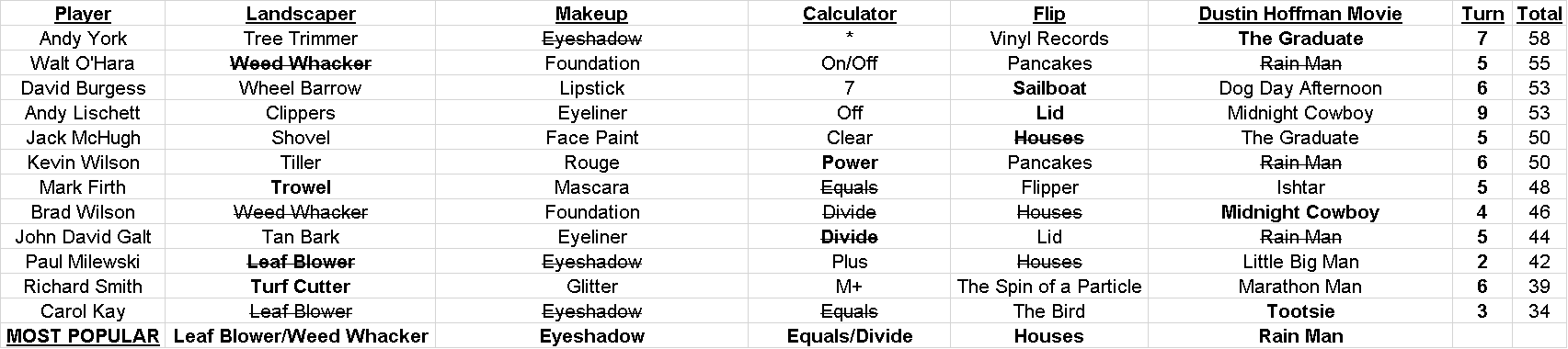 Joker category shown in BOLD. Most popular answer shown in strikethrough.