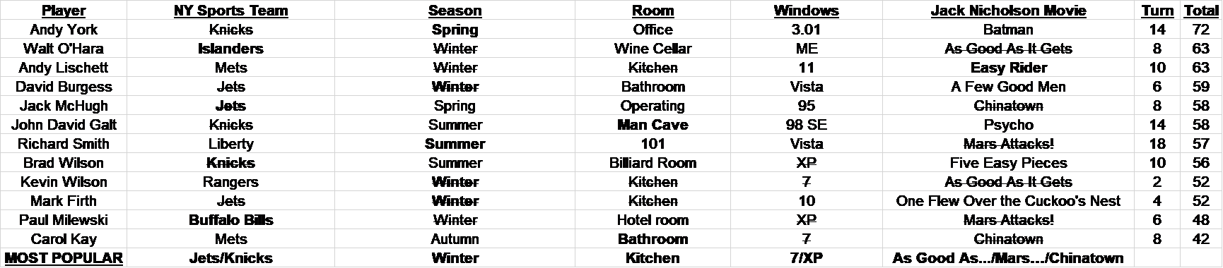 Joker category shown in BOLD. Most popular answer shown in strikethrough.