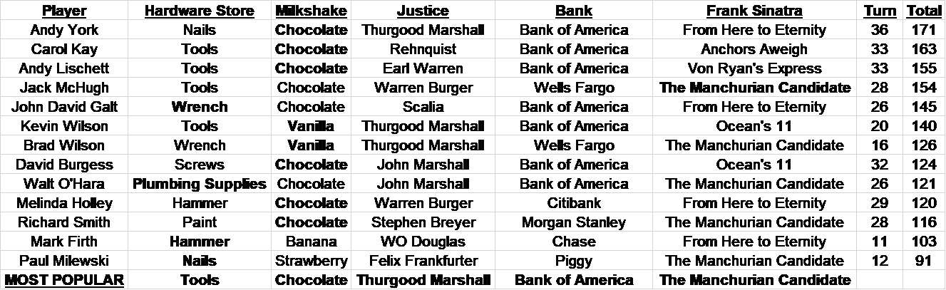 Joker category shown in BOLD. Most popular answer shown in the bottom row.