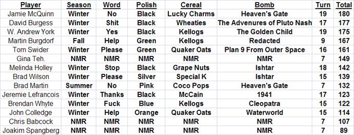 thanks to everyone for playing (and spme very entertaining commentary!)