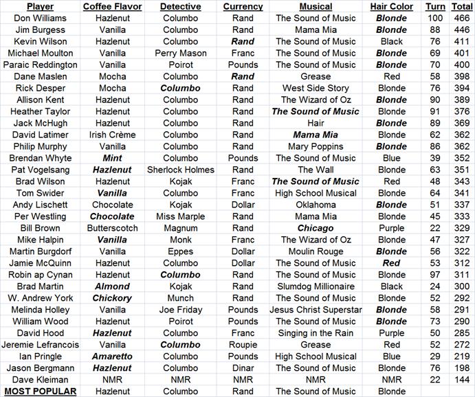 1 = 4), AY – Andy York (0 + 3 = 3), JB – Jim-Bob Burgess (9 + 12 = 21), JM