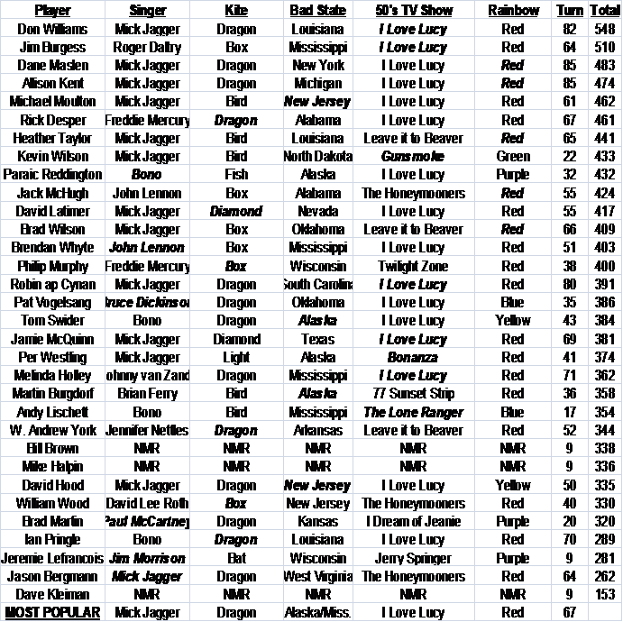 Okay, the deadline has come and gone and the entries are in! The contest is simple: you get one point for