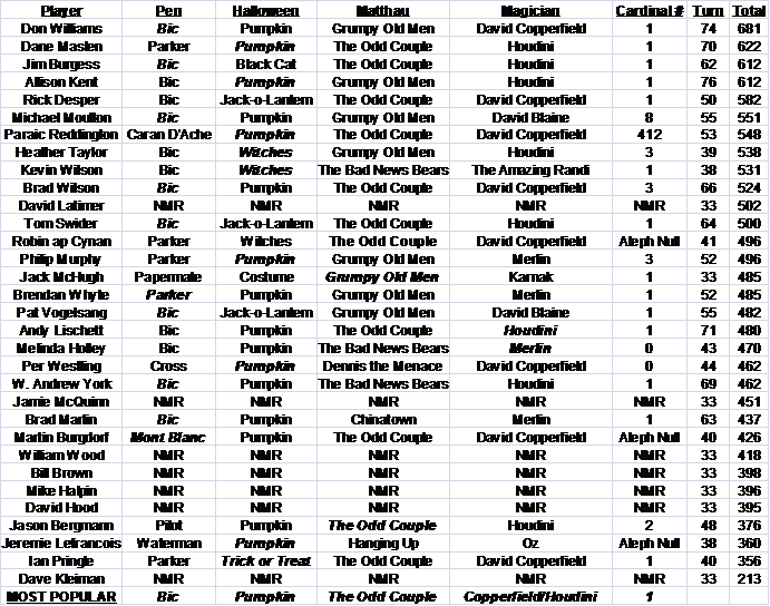 Maslen (0 + 4 = 4), PV - Pat Vogelsang (7 + 40 = 47), RD – Rick Desper (0 + 15