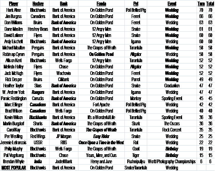 (0 + 15 = 15), MH – Melinda Holley (0 + 0 = 0), RL – Robert Lesco (0 + 4 = 4),