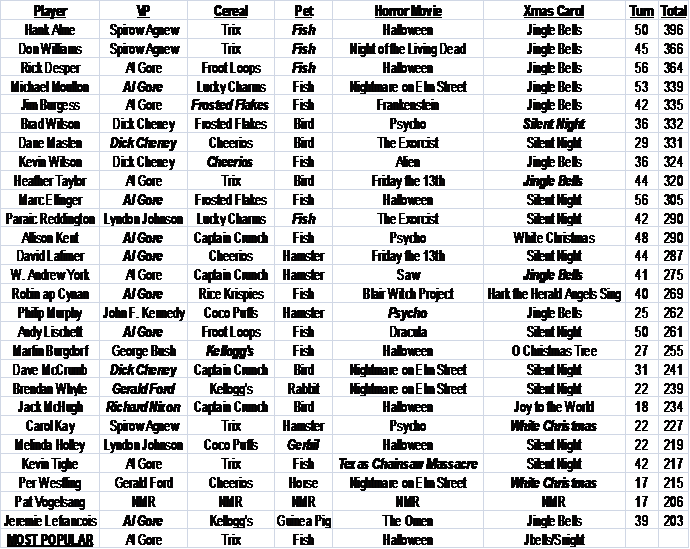 Total Game Points: Jim Burgess – 10; Kevin Tighe – 6; Rick Desper – 4; Paraic Reddington – 4; Jack
