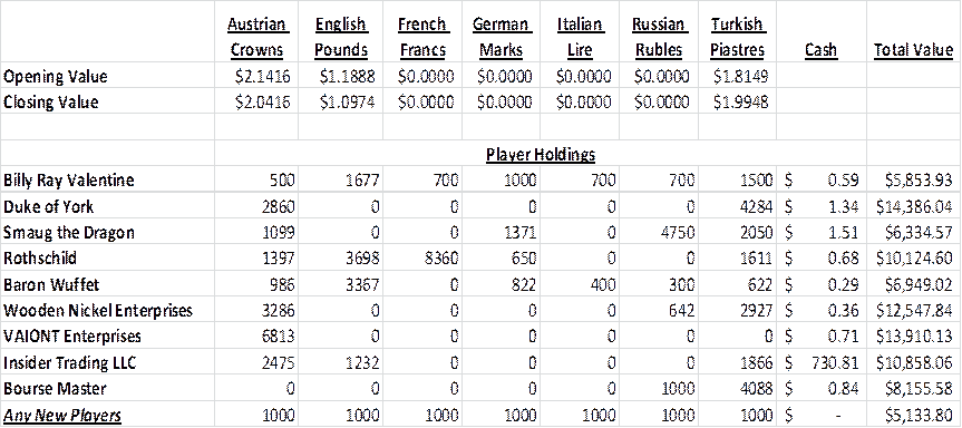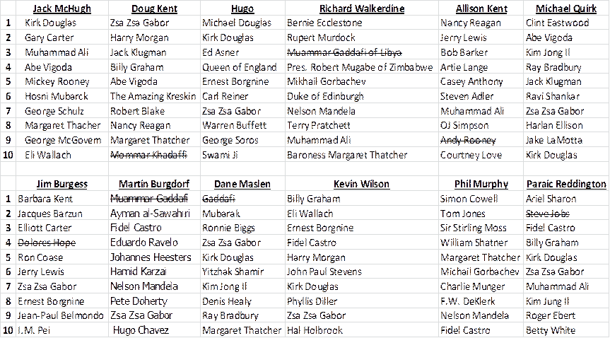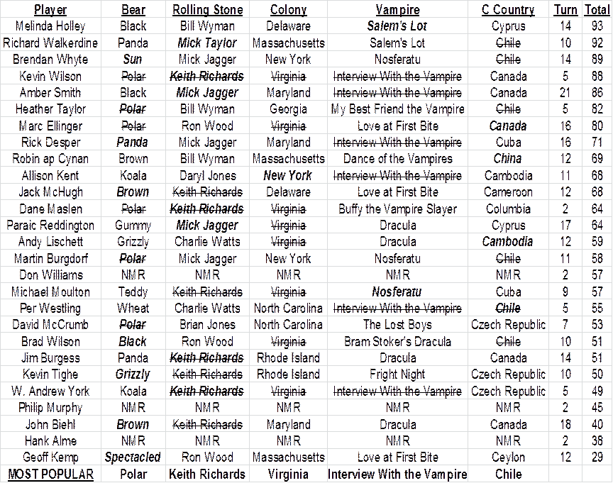 5; Rick Desper [RD] – 4; Jack McHugh [JM] – 4; Kevin Tighe [KT] – 3 ½; Paraic Reddington [PR] – 3; Dave McCrumb