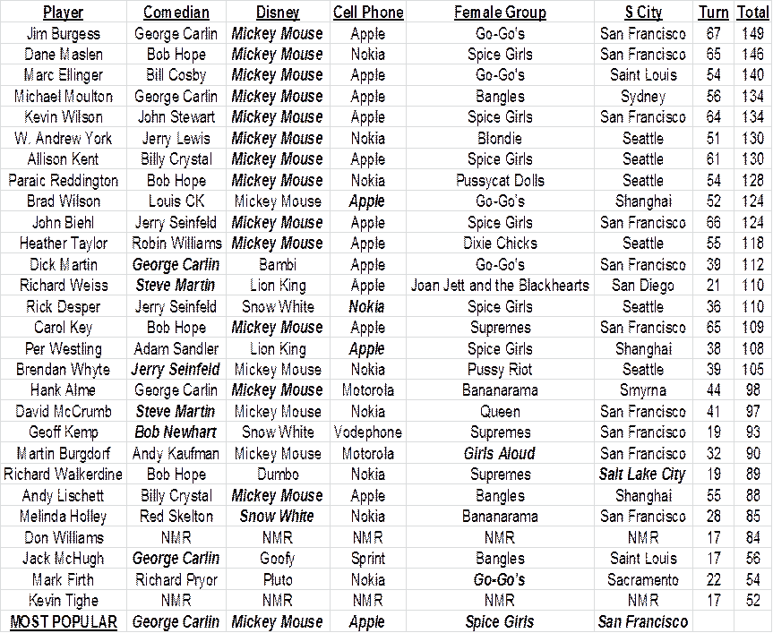 9; Rick Desper [RD] 9; Jack McHugh [JM] 7; Per Westling [PW] 7; Paraic Reddington [PR] 6; Andy York [AY] 6; Andy Lischett [AL] 5; Jim Burgess [JB] 4; Dave McCrumb [DM] 4; Michael Moulton [MM] 3; Brendan Whyte