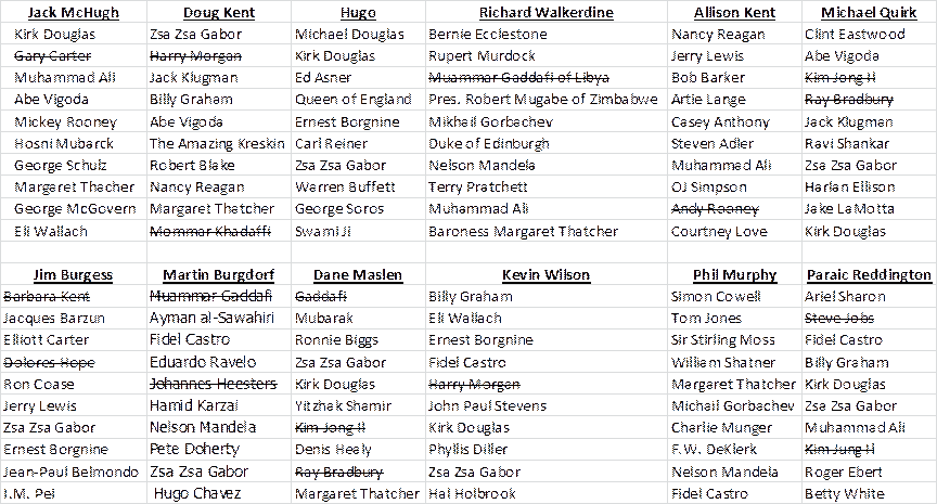 [KT] 4; Hank Alme [HA] 2; Brad Wilson [BW] 1; Paraic Reddington [PR] 1; Andy