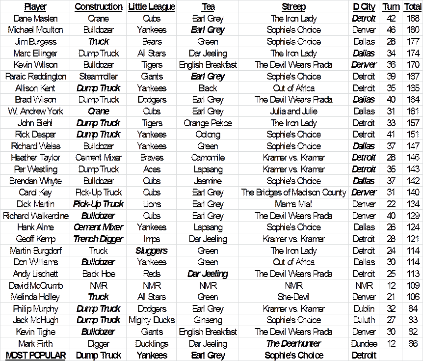 second turn of his Yahtzee! Game). Jim Burgess is as youd expect late with