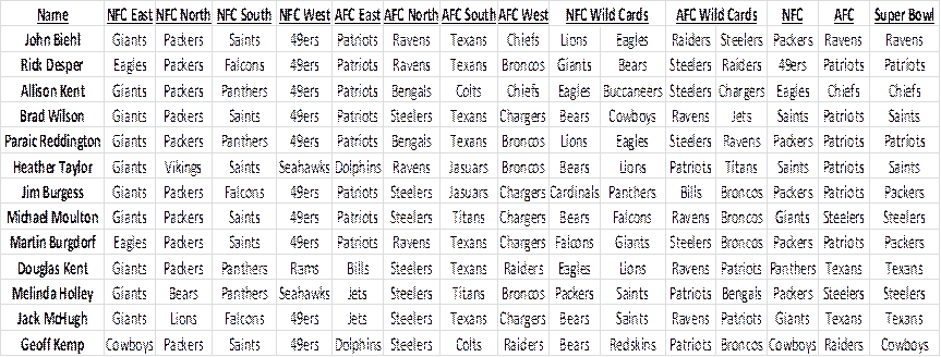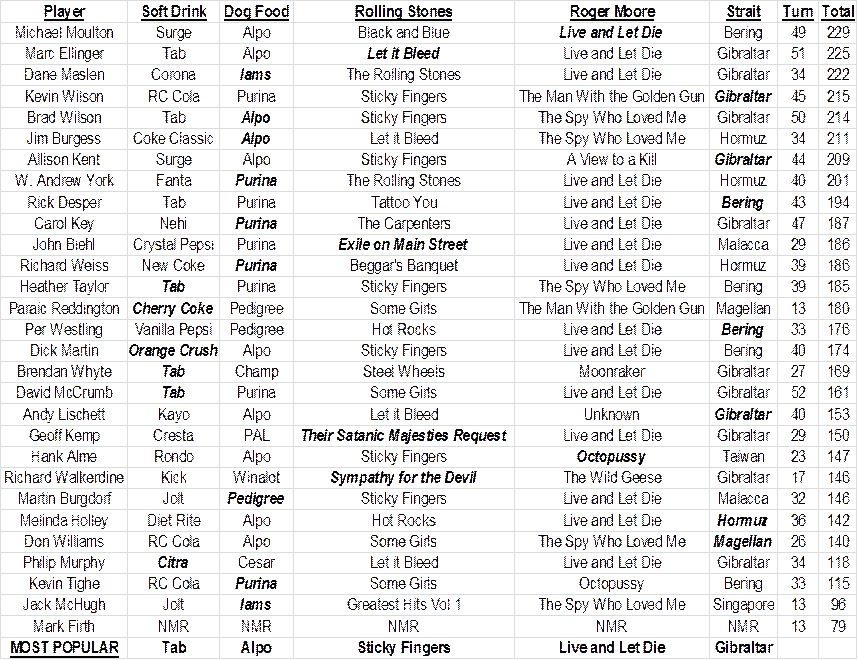 Kevin Wilson [KW] – 18; Kevin Tighe [KT] – 9; Andy Lischett [AL] – 7; Michael Moulton [MM] – 4; Andy York [AY]