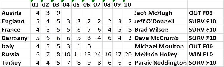 5; Andy York [AY] – 5; Andy Lischett [AL] – 3; Paraic Reddington [PR] – 3; Dave McCrumb [DM] – 3; Michael Moulton [MM] – 2; Brendan Whyte –