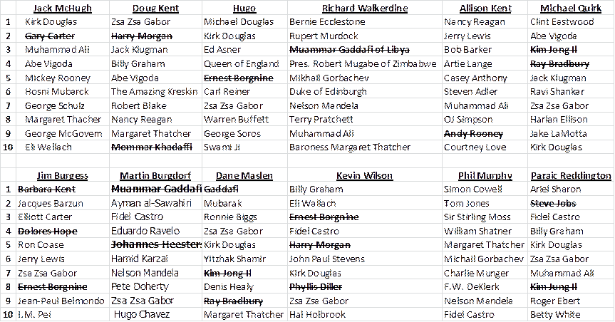 Correct – KW, AL, RD, JM, KT. Lobster Man From Mars – JB. It’s