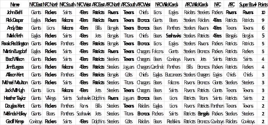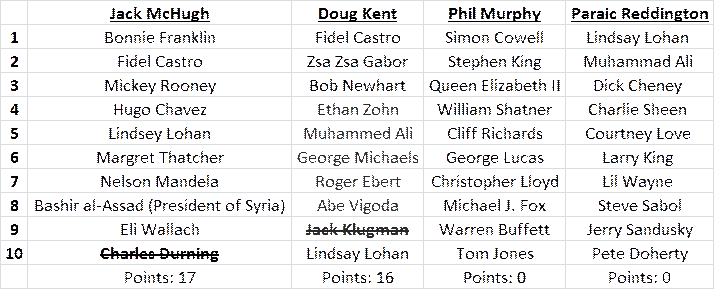– 0; Paraic Reddington [PR] – 0; Kevin Wilson [KW] – 0; Rick Desper [RD] - 0.