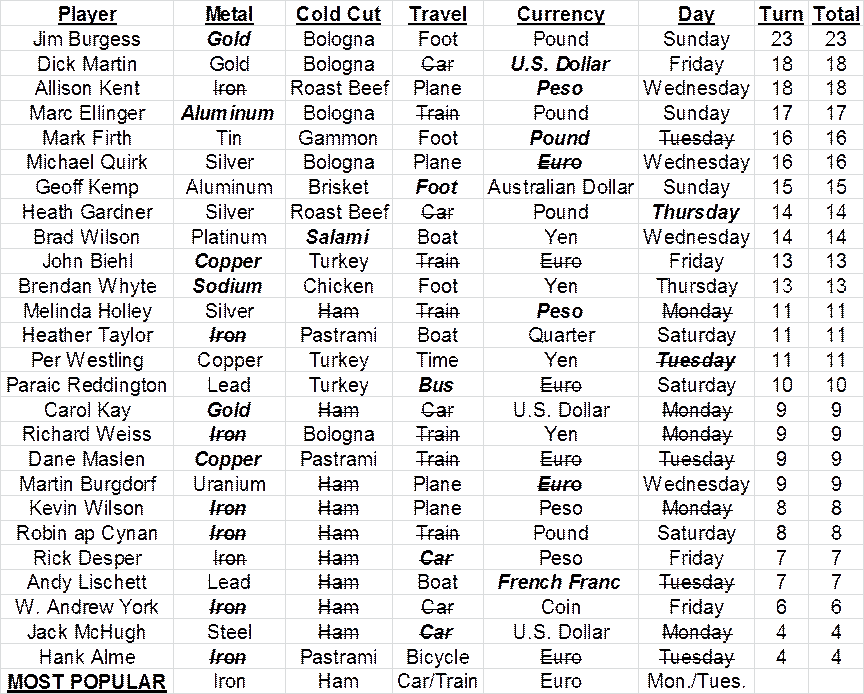 the points (if three players tie for first, they EACH get 3 points). High score at the end of ten rounds wins the game, and a prize (unless you cheated). If there’s enough participation I may give a