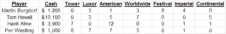 Andy Lischett [AL] – 4; Andy York [AY] – 4; Hank Alme [HA] – 4; Paraic Reddington [PR] – 3, Don Williams [DW] – 3; Marc Ellinger [ME] - 1.