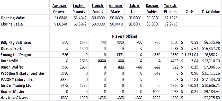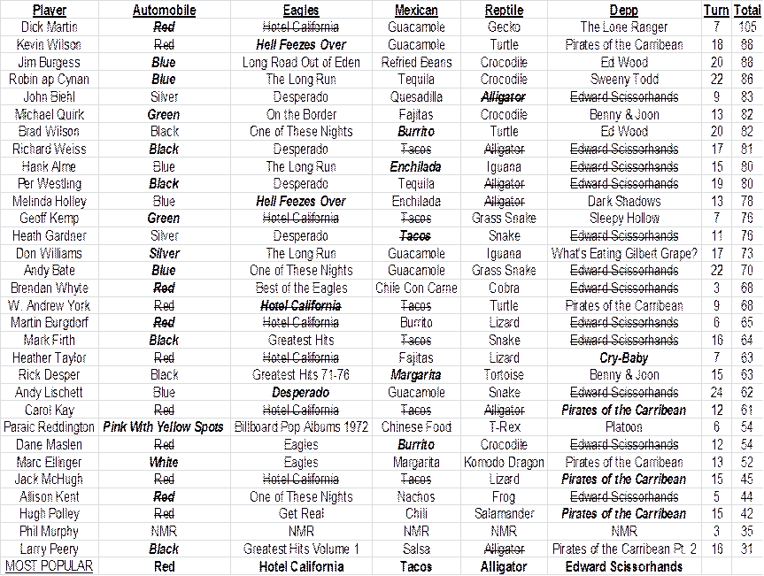 the points (if three players tie for first, they EACH get 3 points). High score at the end of ten rounds wins the game, and a prize (unless you cheated). If there’s enough participation I may give a
