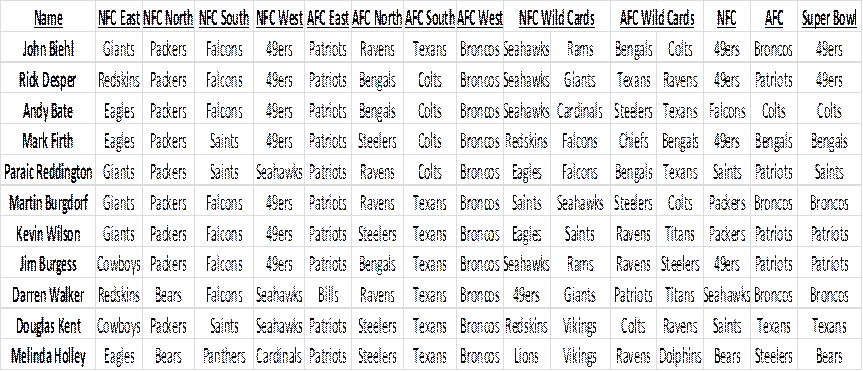 Kevin Wilson [KW] – 2; Hank Alme [HA] – 2; Andy Lischett [AL] – 2; Andy York [AY] - 1..