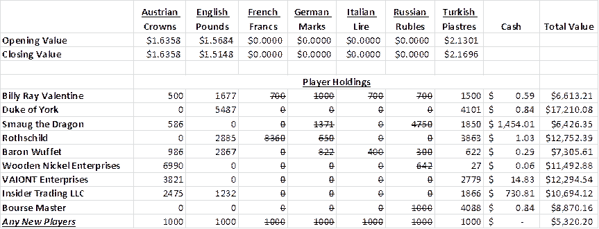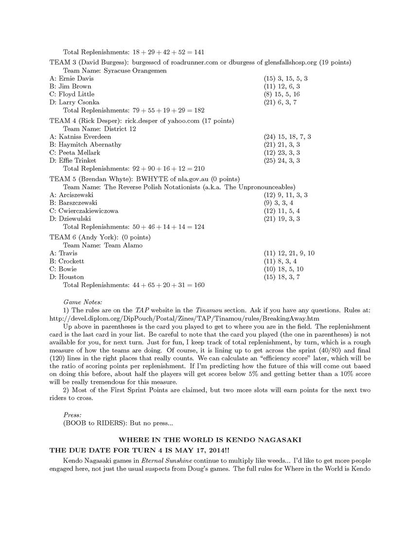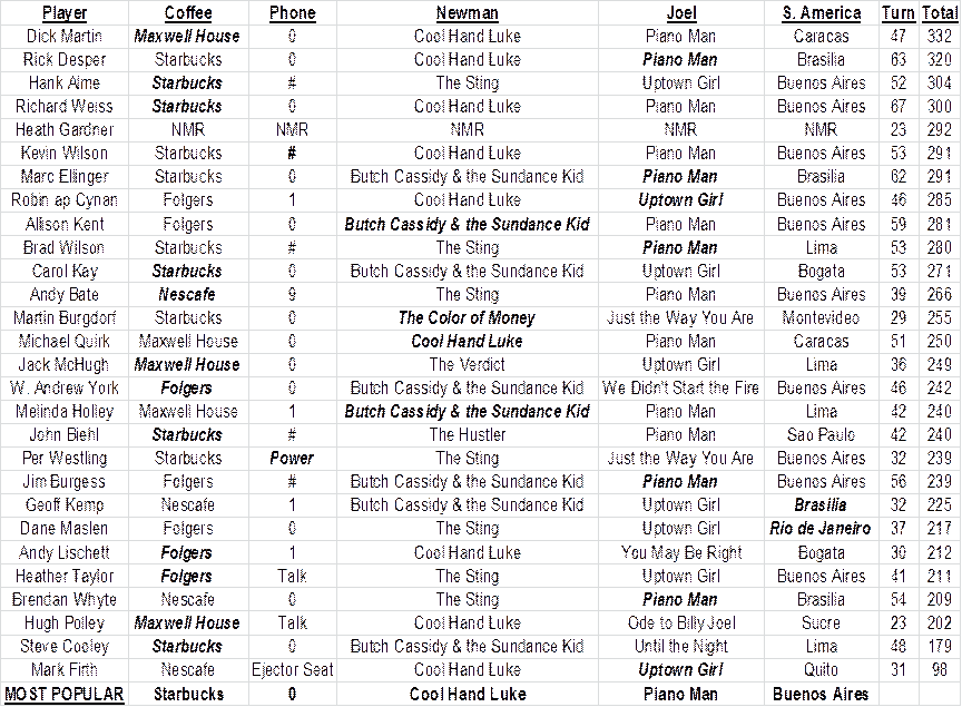 the points (if three players tie for first, they EACH get 3 points). High score at the end of ten rounds wins the game, and a prize (unless you cheated). The final round will be worth double points.